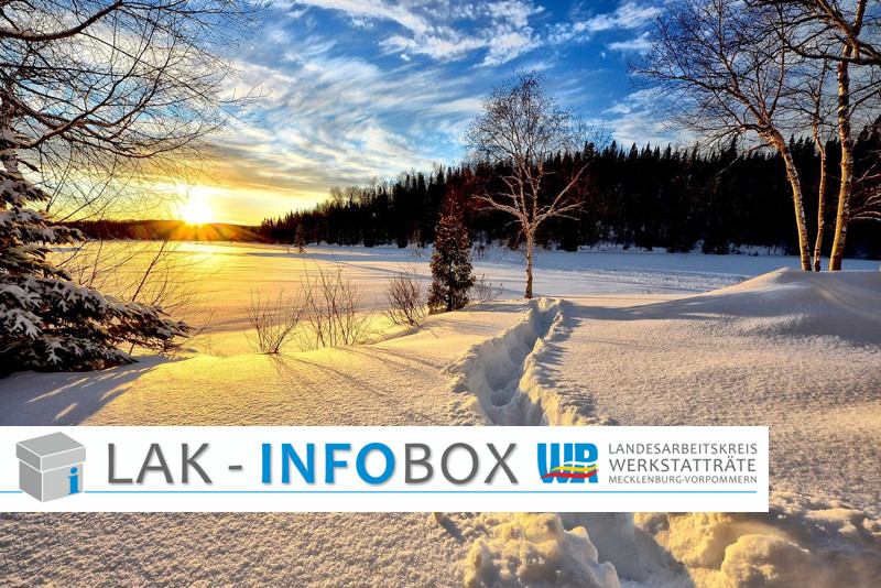 Manchmal zeigt sich die Sonne aber doch. Dann taucht sie die Landschaft in ein zauberhaftes Licht. So wie auf dem Titel-Bild der aktuellen Ausgabe. Auch die neue Info-Box möchte für euch ein Lichtblick sein. Wir berichten in dieser Ausgabe wieder über Neuigkeiten aus den Werkstätten. Auch in der Geschäfts-Stelle des Landes-Arbeits-Kreis der Werkstatt-Räte MV hat sich einiges getan. Ihr dürft gespannt sein. Und für alle, die noch nicht genug von den leckeren Plätzchen haben: Auf Seite 14 findet ihr ein tolles Rezept für Zimtsterne.